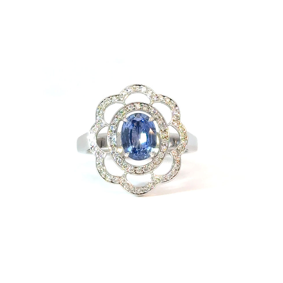 - Un saphir ovale se pare de deux entourages pavés, aux courbes florales et délicates.